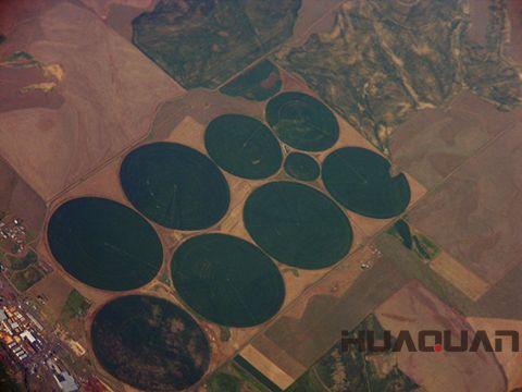 灌溉設備的長度有200米左右,工作起來有點像是圓規,以一端為圓點,灌溉設備圍繞圓點以很慢的速度運行。工作人員不需要進入田地中,農作物即可享受水的滋潤。所以他們的農民遠比我們赤腳上陣的農民幸福得多。